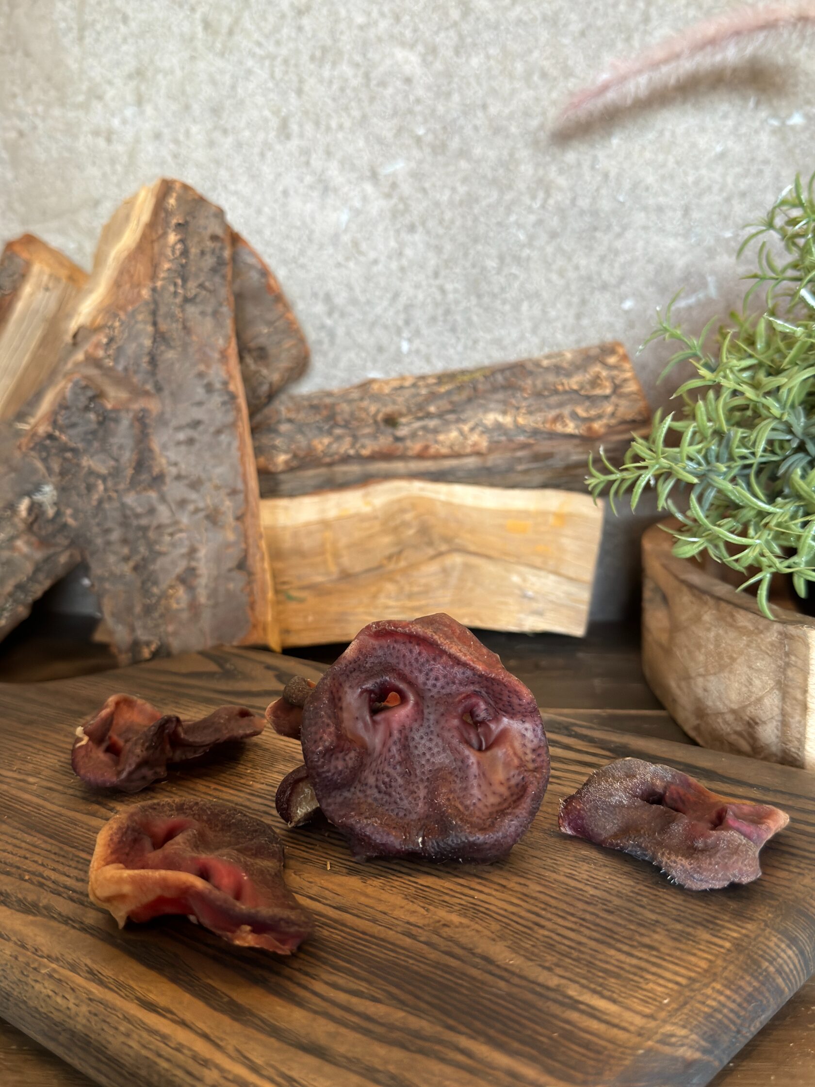 Говяжий нос - одно из самых популярных лакомств как для взрослых собак, так и для щенков во время смены зубов. Содержит много витаминов группы B и незаменимых витаминов групп A и D, а так же богат железом, йодом и калием, магнием. За счет содержания большого количества белка и коллагеновых волокон хорошо способствует укреплению хрящевой ткани. Мясо в говяжьем носе богато фолиевой кислотой - она необходима для развития иммунной и кровеносной систем собаки.